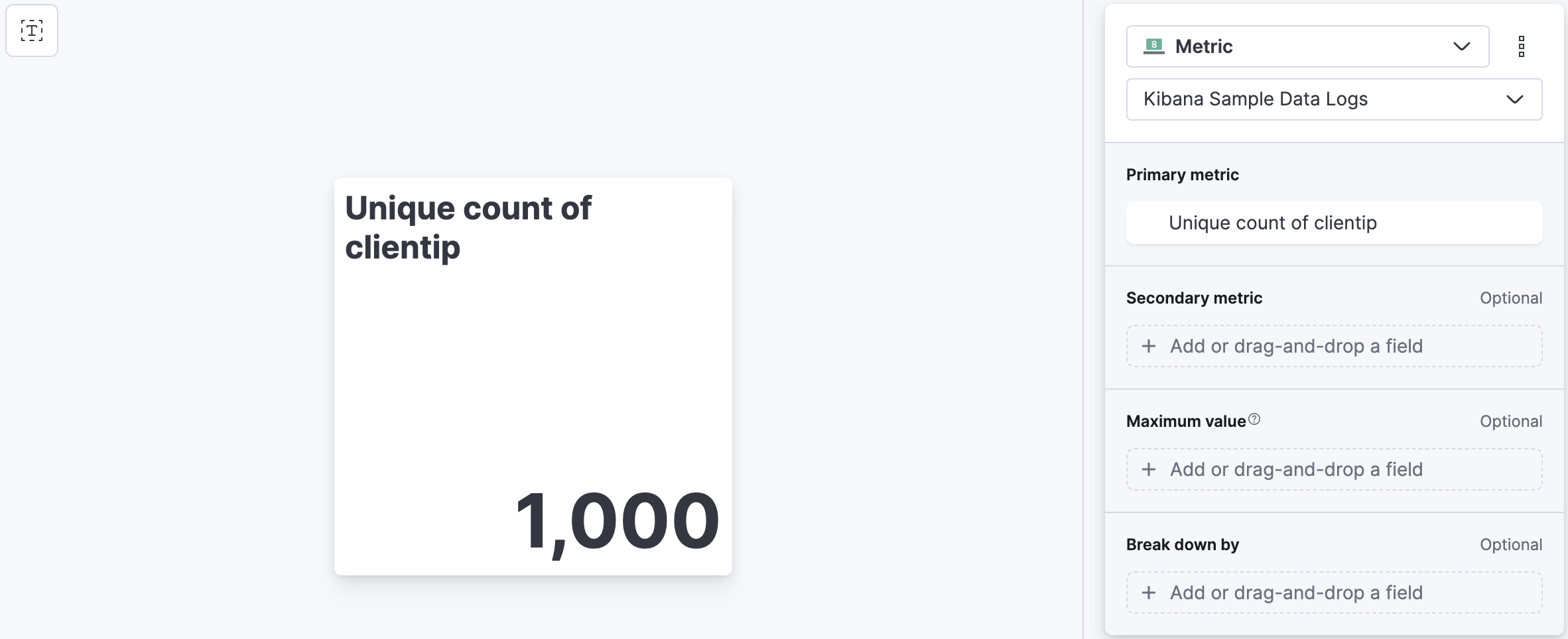 Pick a field you want to analyze, such as clientip. To analyze only the clientip field, use the Metric visualization to display the field as a number.