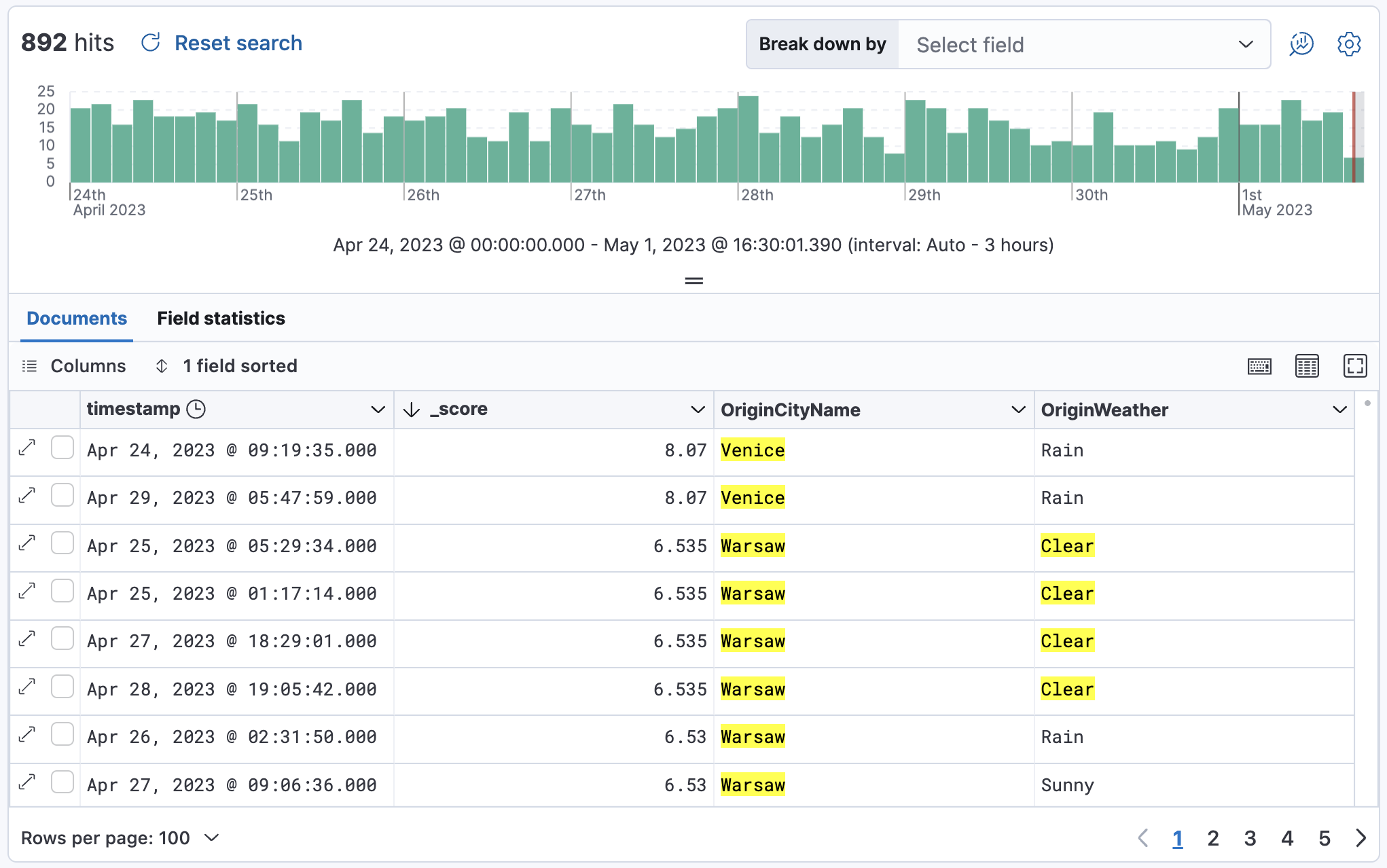 This example shows how to use Discover to list your documents from most relevant to least relevant. This example uses the sample flights data set, or you can use your own data.