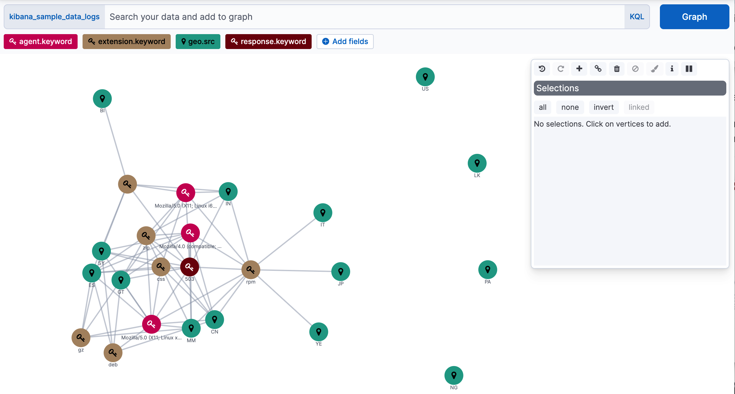 The graph analytics features provide a simple, yet powerful graph exploration API, and an interactive graph visualization app for Kibana. Both work out of the box with existing Elasticsearch indices—you don’t need to store any additional data to use these features.
