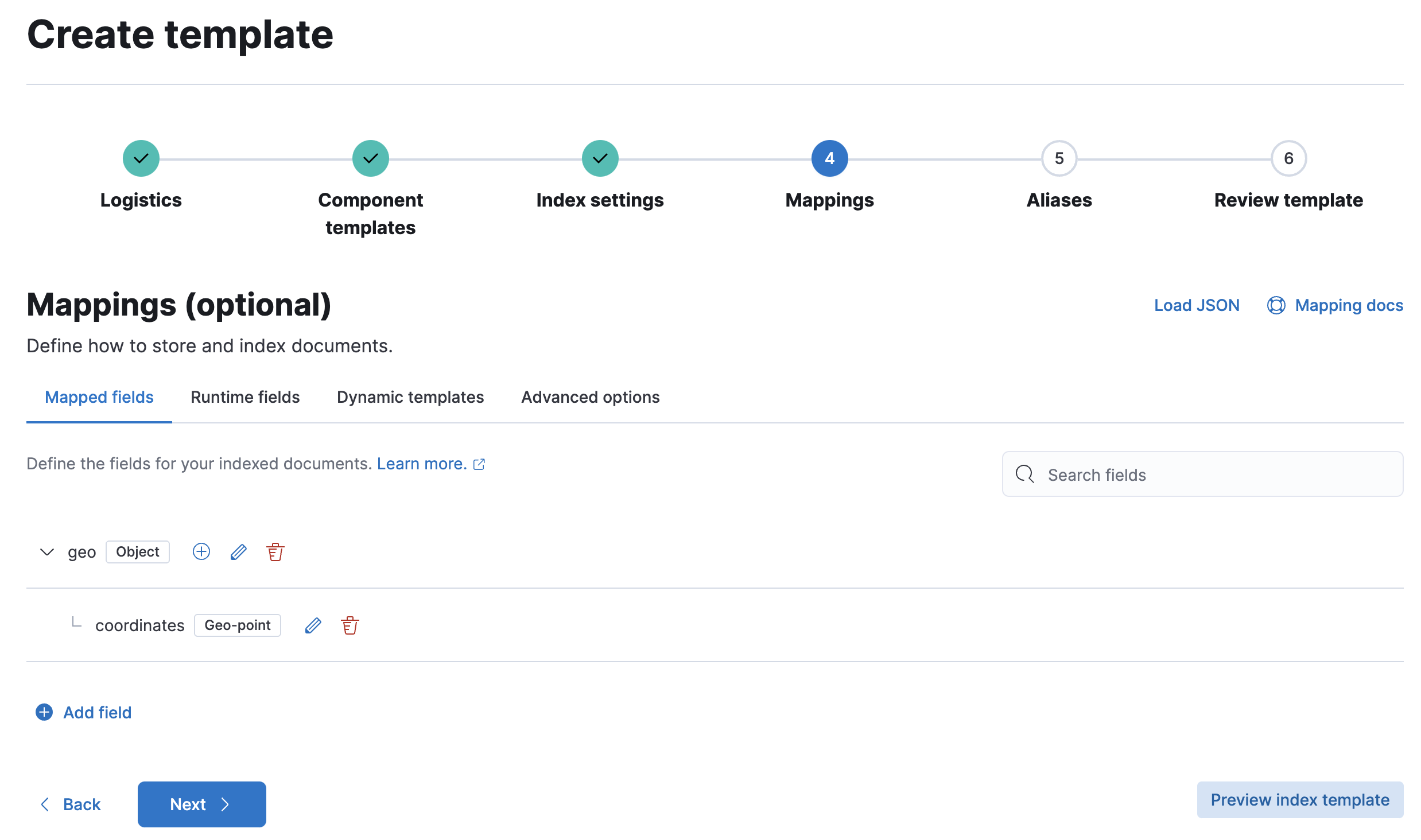 You can create additional mapping configurations in the Dynamic templates and Advanced options tabs. For this tutorial, do not create any additional mappings.