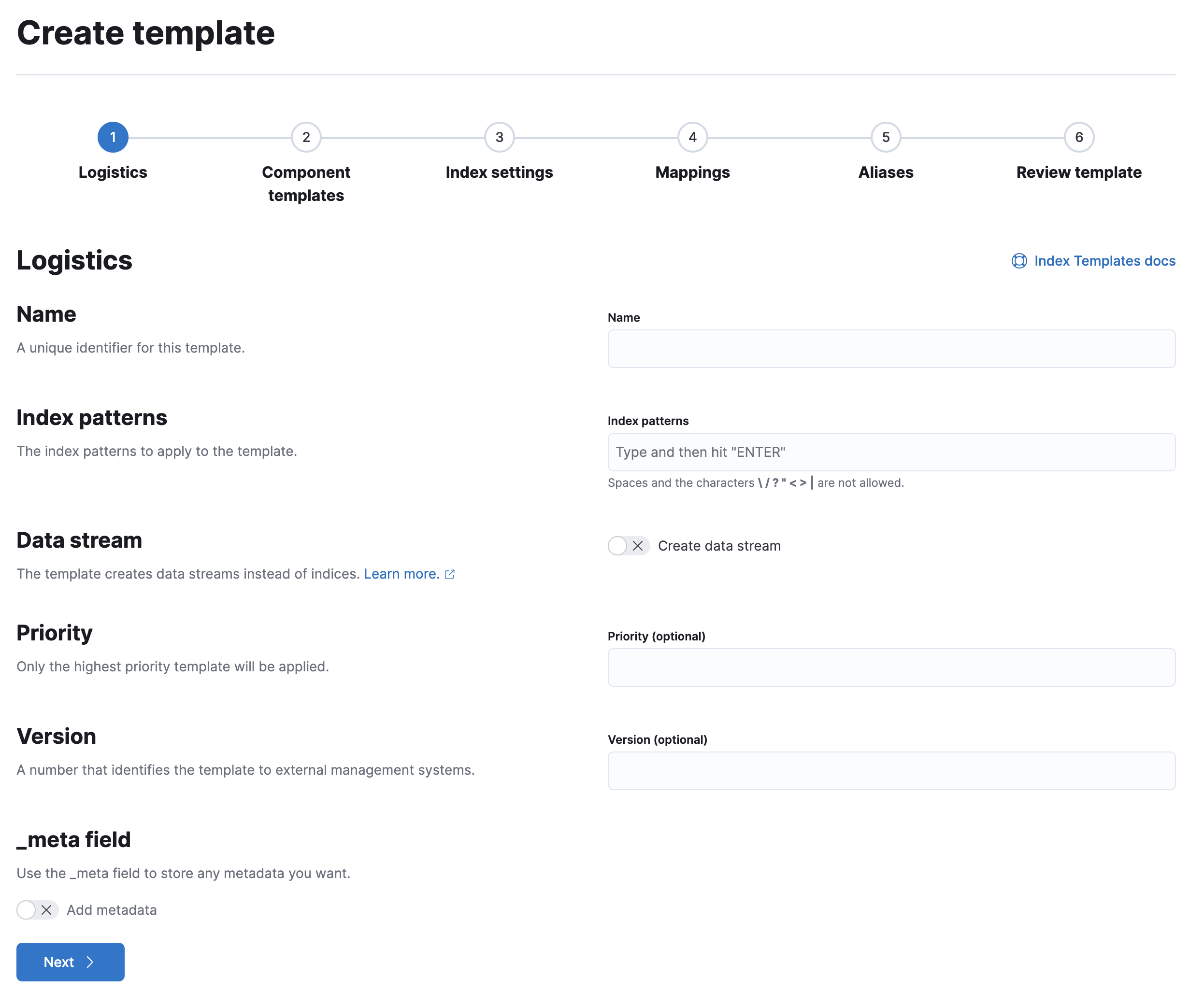 so the template matches any index with that index pattern.Leave Data Stream, Priority, Version, and _meta field blank or as-is.