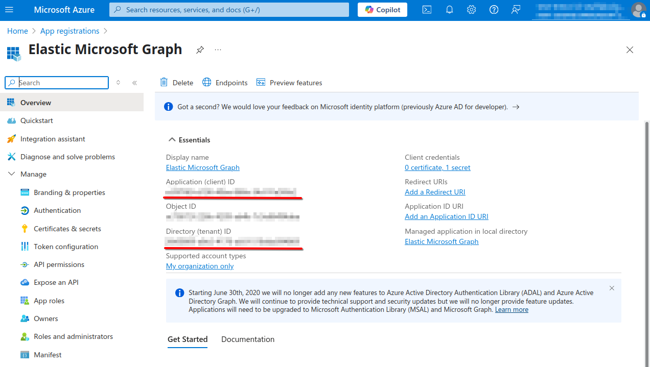 Take note of the Application (client) ID and Tenant ID shown here. These will be needed to configure Elasticsearch later.