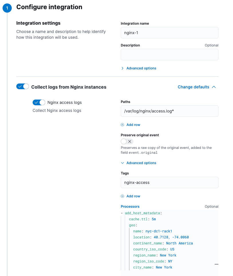 Under integration settings in the Integrations UI in Kibana. For example, when configuring an Nginx integration, you can define processors for a specific dataset under Advanced options. The processor in this example adds geo metadata to the Nginx access logs collected by Elastic Agent: