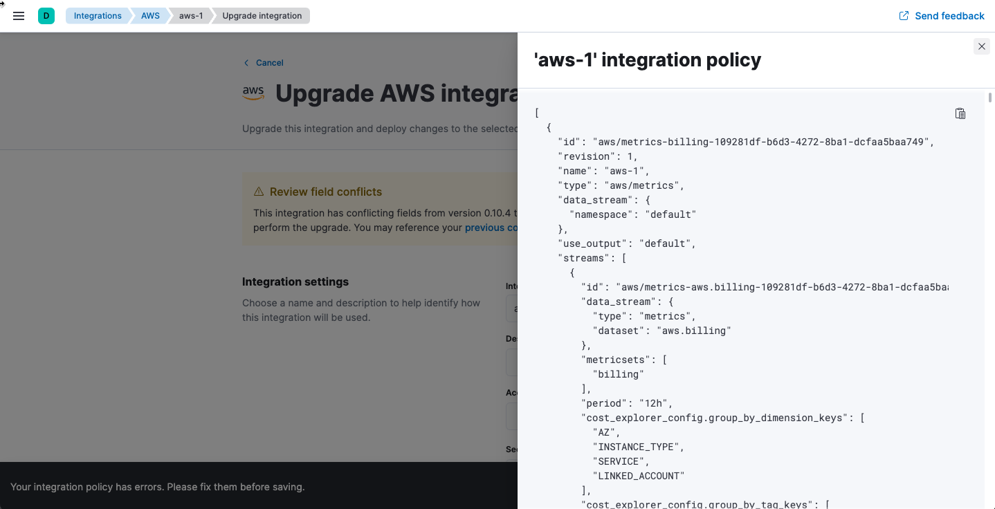1. Under Review field conflicts, notice that you can click previous configuration to view the raw JSON representation of the old integration policy and compare values. This feature is useful when fields have been deprecated or removed between releases.