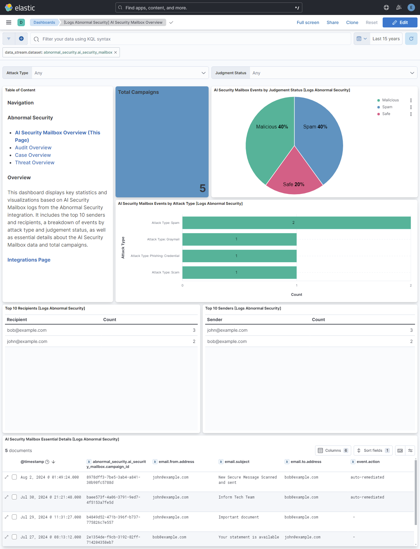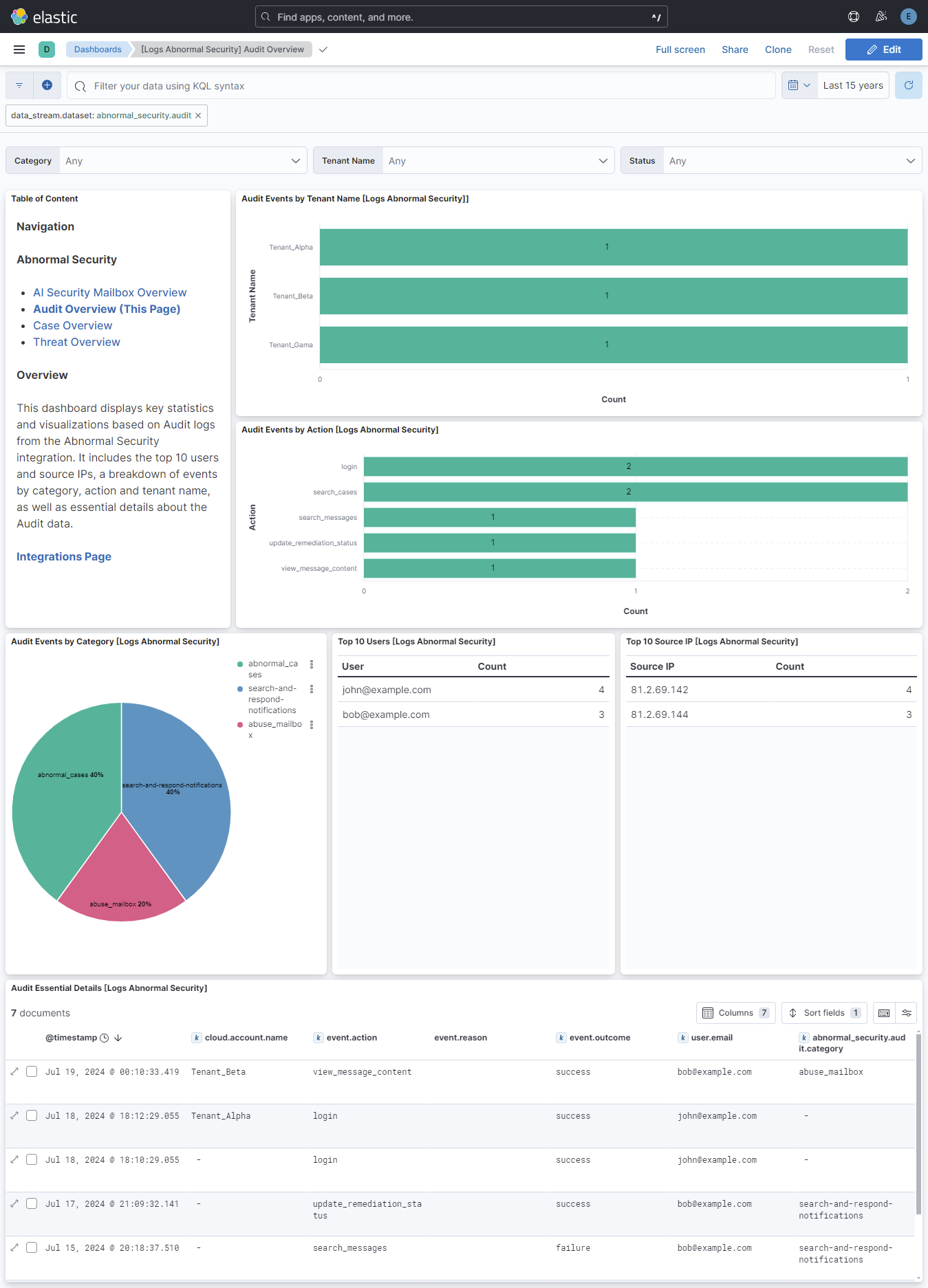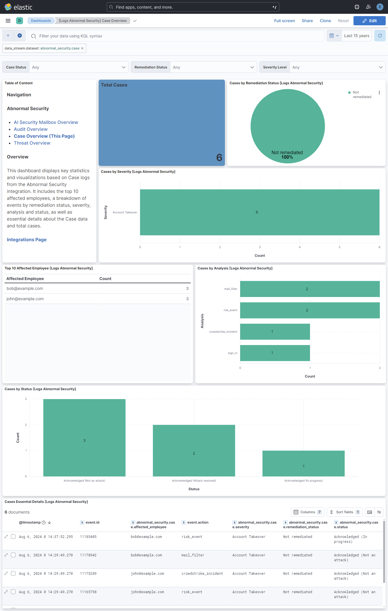 The Abnormal AI integration collects data for AI Security Mailbox (formerly known as Abuse Mailbox), Audit, Case, and Threat logs using REST API.