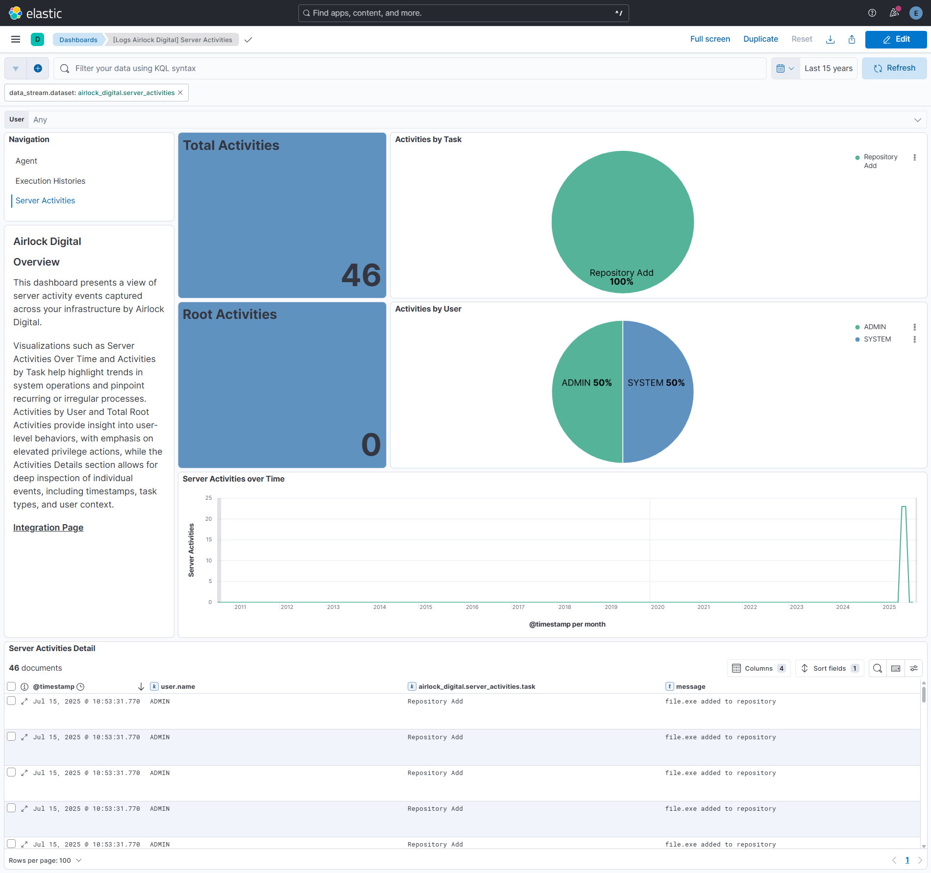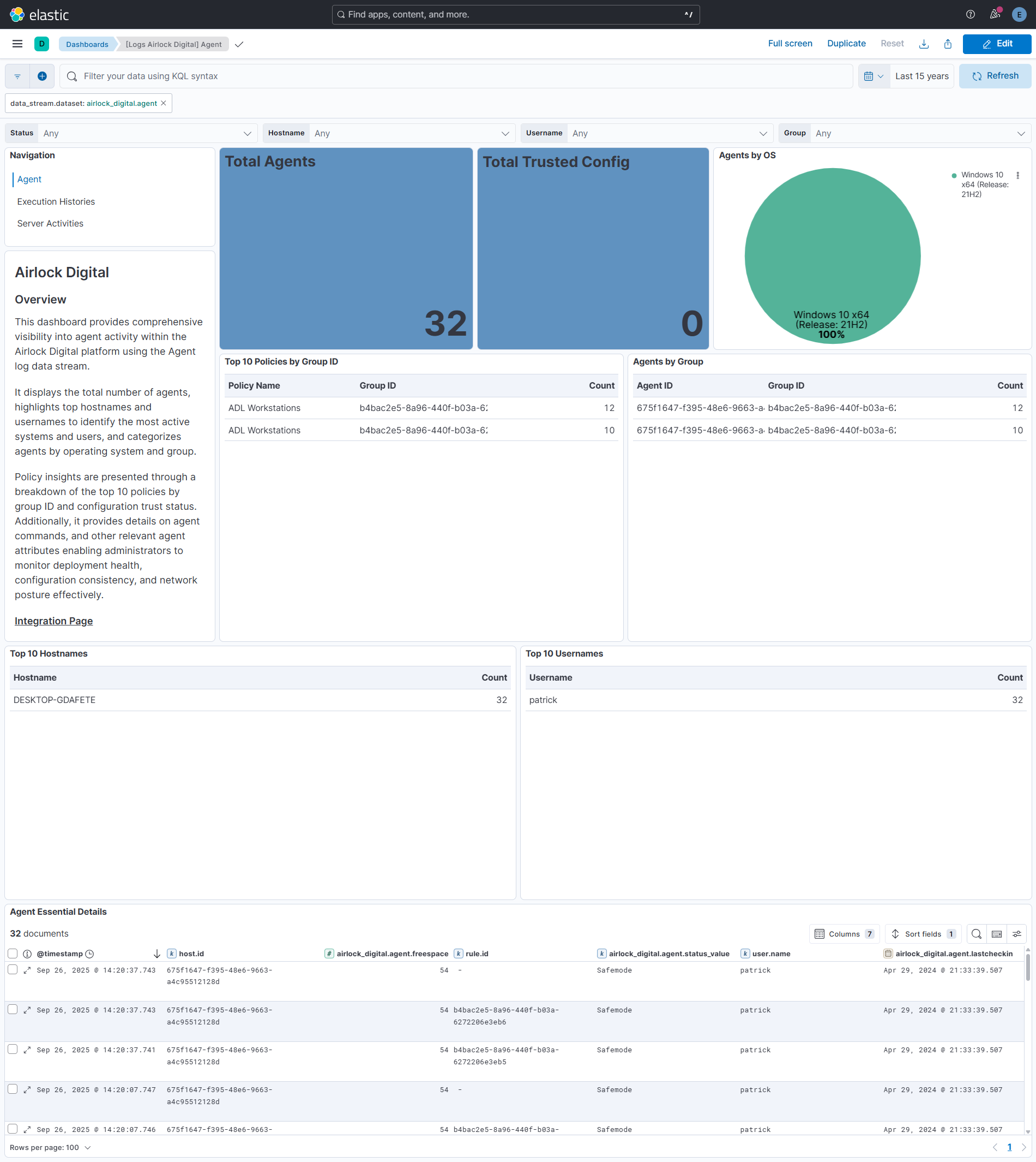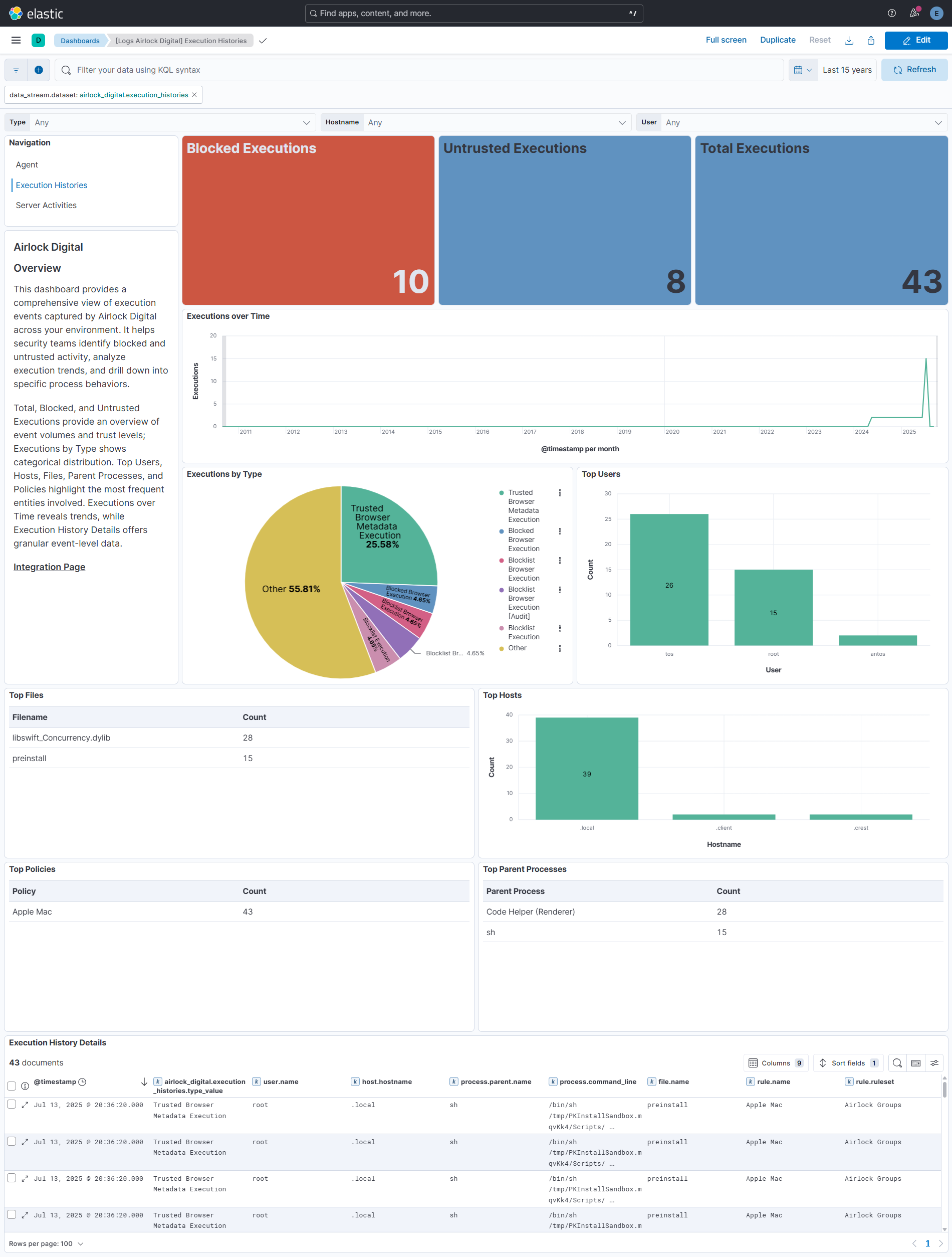 Integrating Airlock Digital agent, execution history, and server activity logs with Elastic SIEM delivers comprehensive visibility into endpoint and system operations. Dashboards highlight agent health, user and host activity, OS distribution, policy enforcement, storage status, trusted configurations, and execution behaviors such as blocked or untrusted runs and policy violations. At the same time, monitoring server-side activities across tasks, users, and root actions enables quick identification of unauthorized changes, policy misuse, and suspicious behavior. Together, these insights empower SOC teams to accelerate investigations, strengthen compliance, optimize resource management, and maintain stronger endpoint and system security.