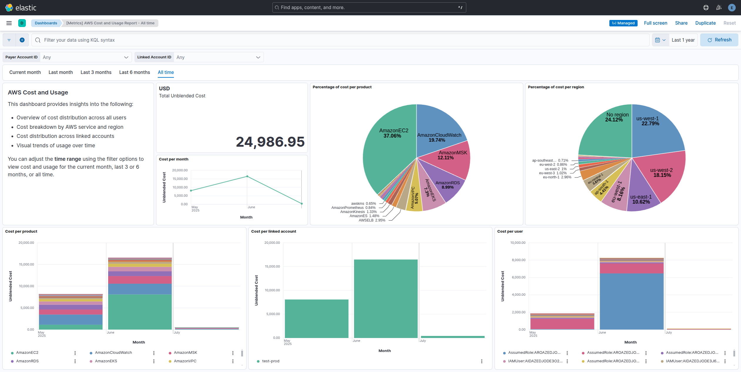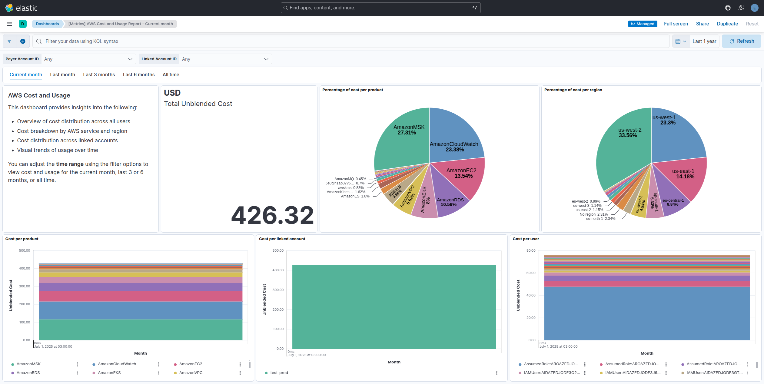 The AWS CUR 2.0 Billing integration allows you to seamlessly collect and ingest Cost and Usage Report (CUR) version 2.0 data exported to an Amazon S3 bucket, using the Elastic Agent. This enables you to monitor, analyze, and visualize AWS billing data with the power of the Elastic Stack.