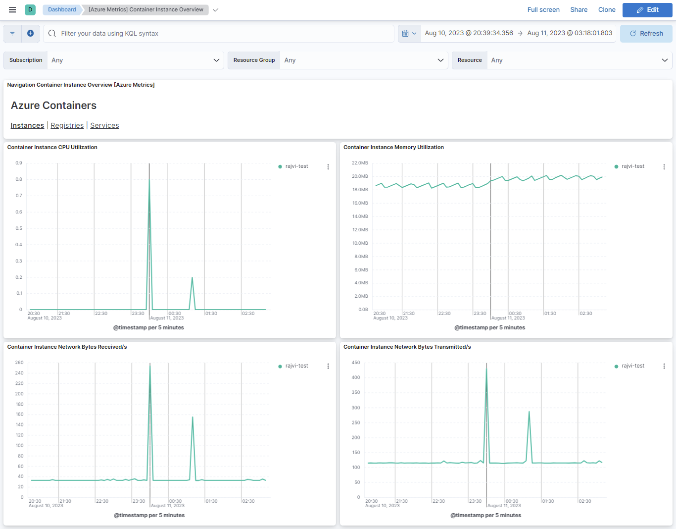 The Azure Container Instance data stream collects and aggregates container instance related metrics from Azure Container instance type resources where it can be used for analysis, visualization, and alerting. The Azure Container Instance will periodically retrieve the Azure Monitor metrics using the Azure REST APIs as MetricList. Additional Azure API calls will be executed to retrieve information regarding the resources targeted by the user.