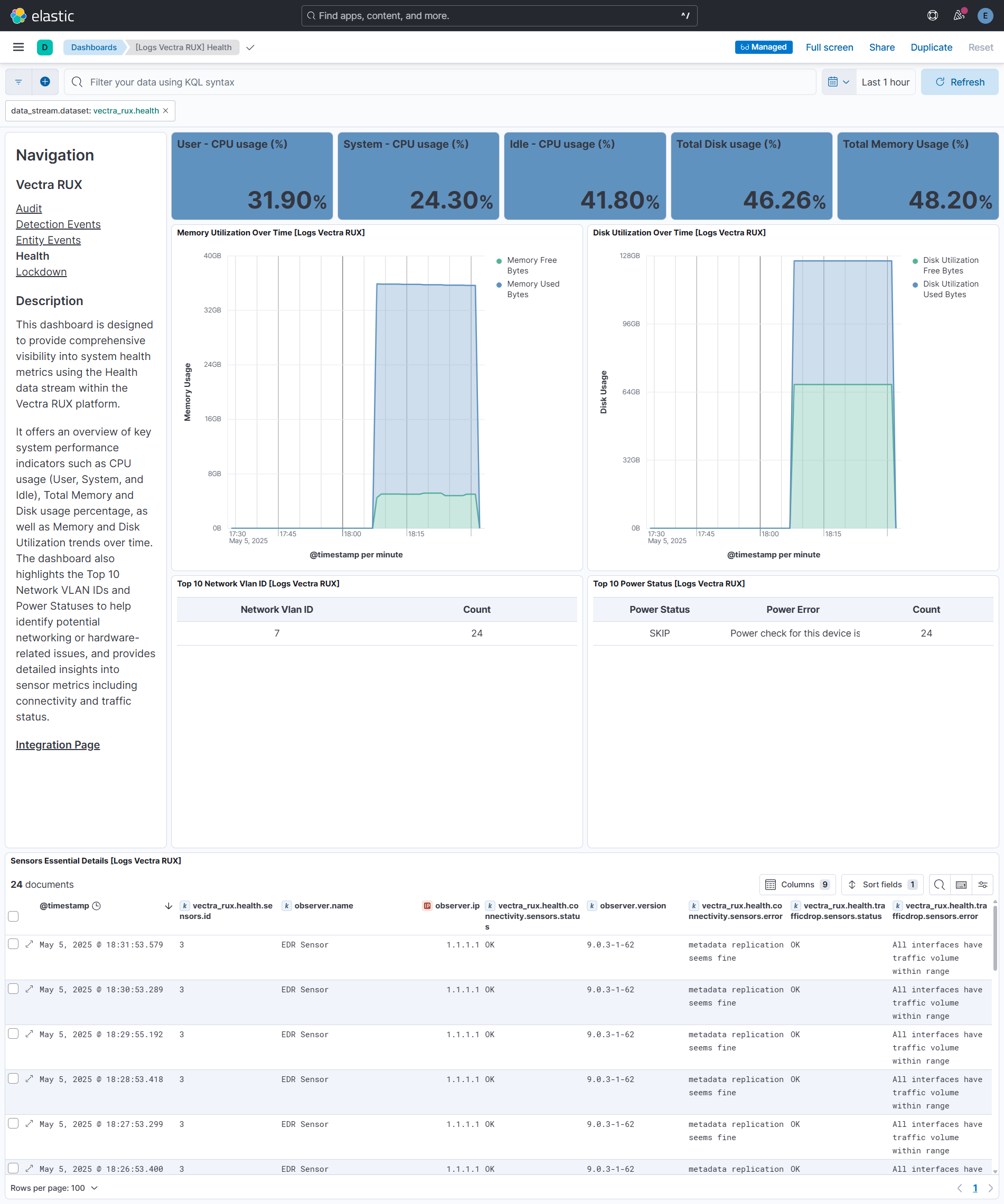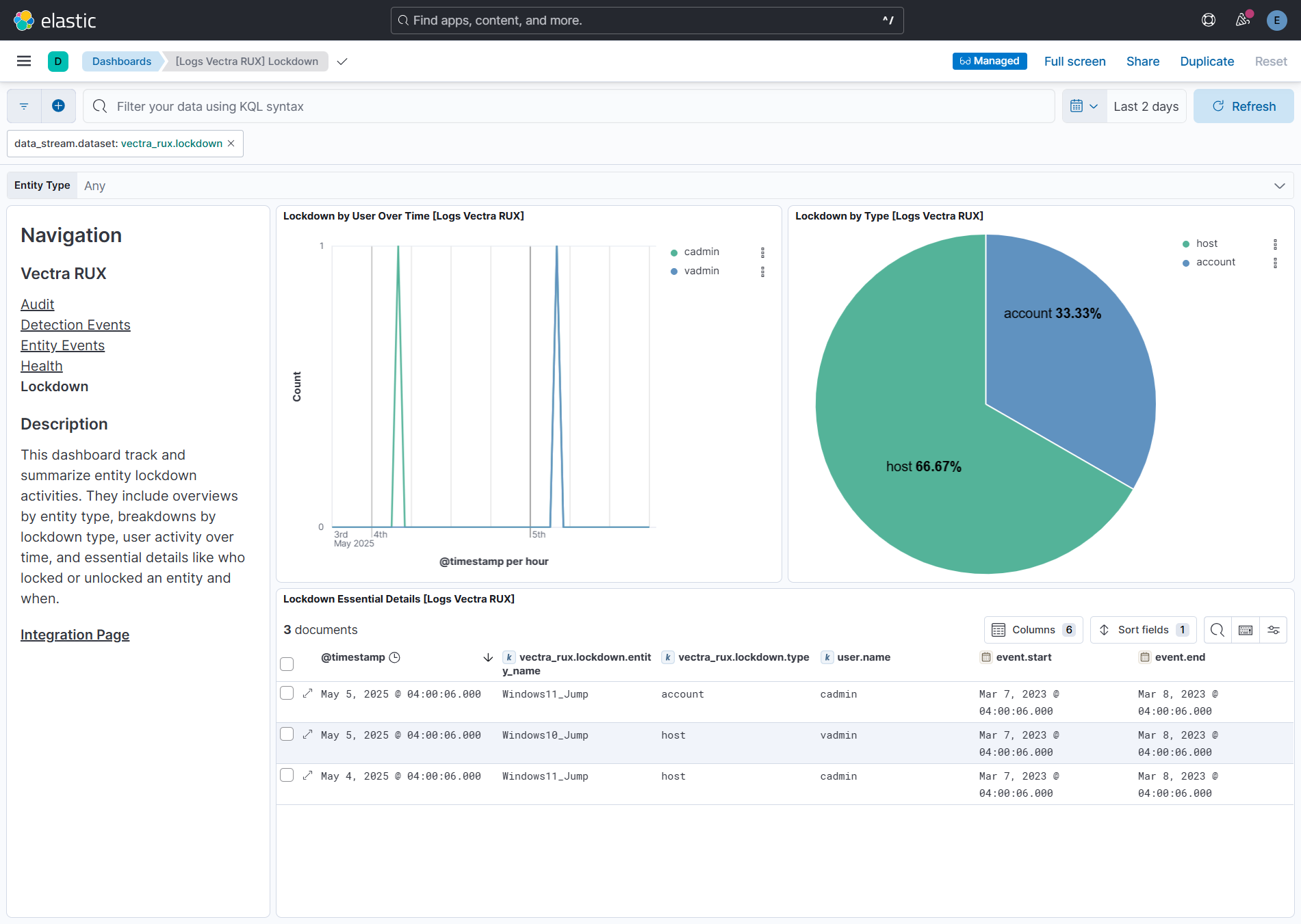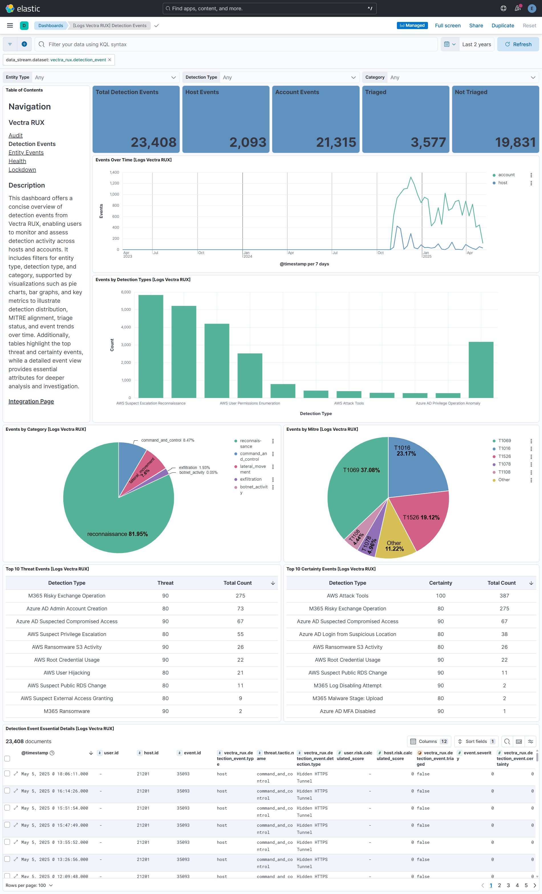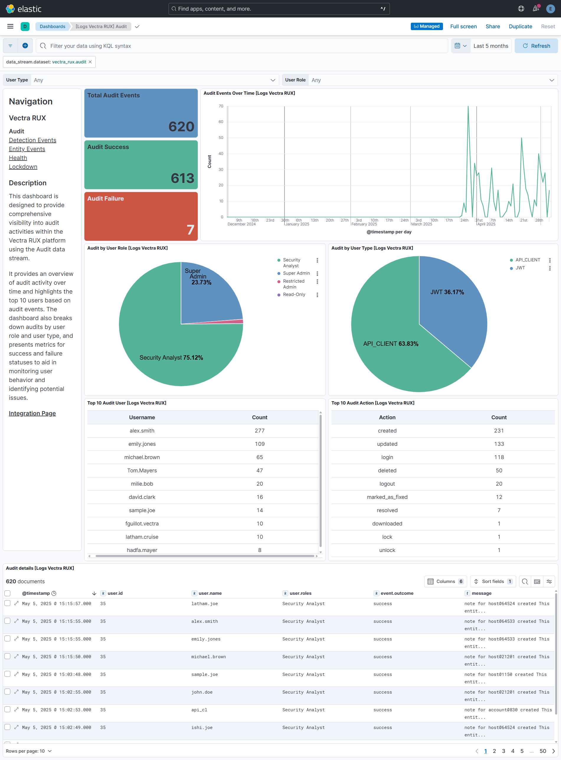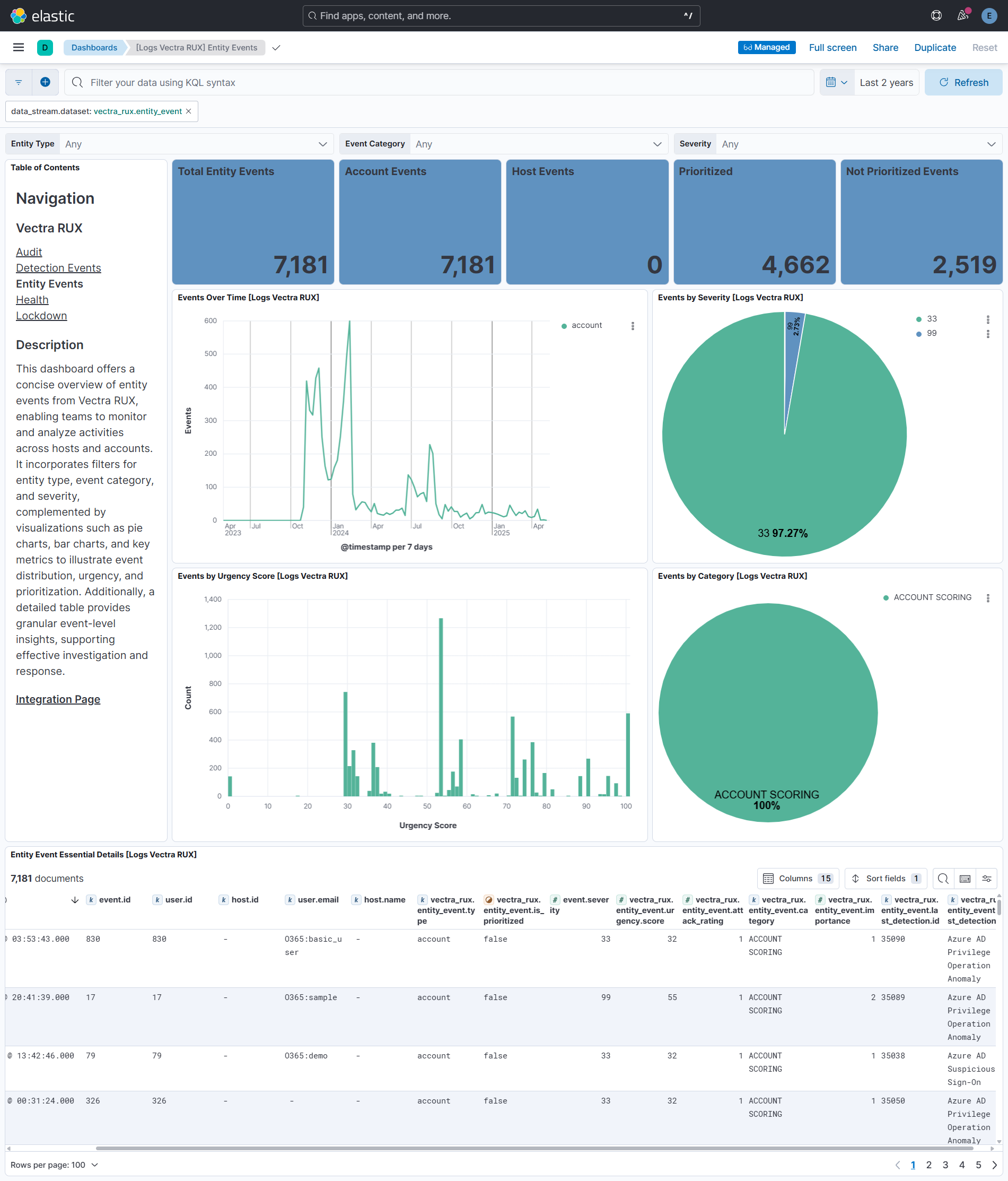 This integration enables to collect, parse Audit, Detection Event, Entity Event, Health and Lockdown data via Vectra RUX REST API, then visualise the data in Kibana.