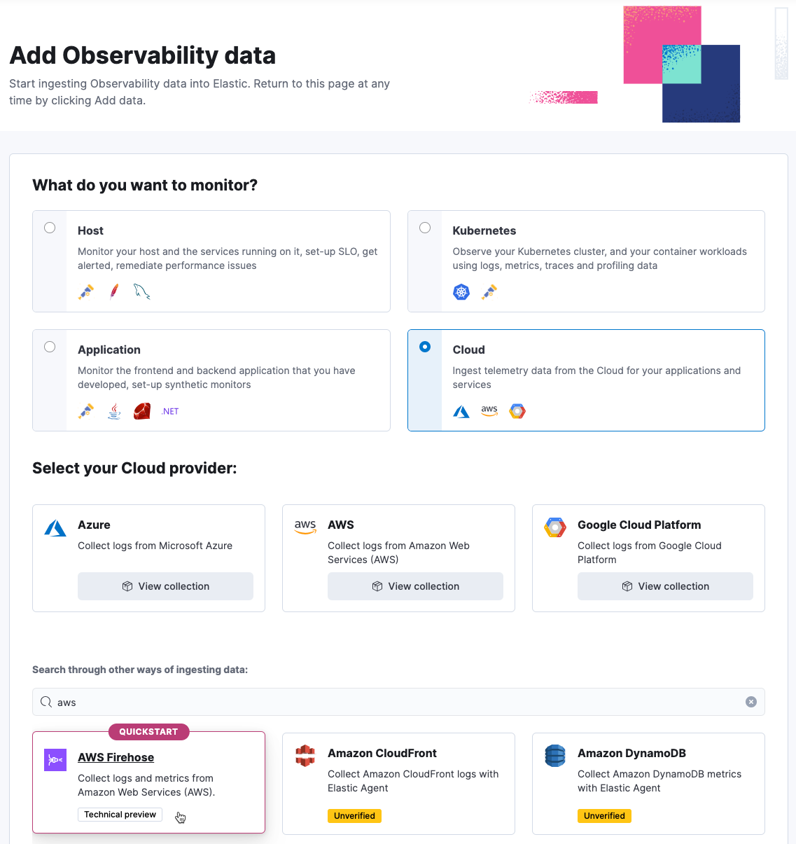 Data collection with AWS Firehose is supported on Elastic Cloud Hosted deployments in AWS, Azure and GCP.