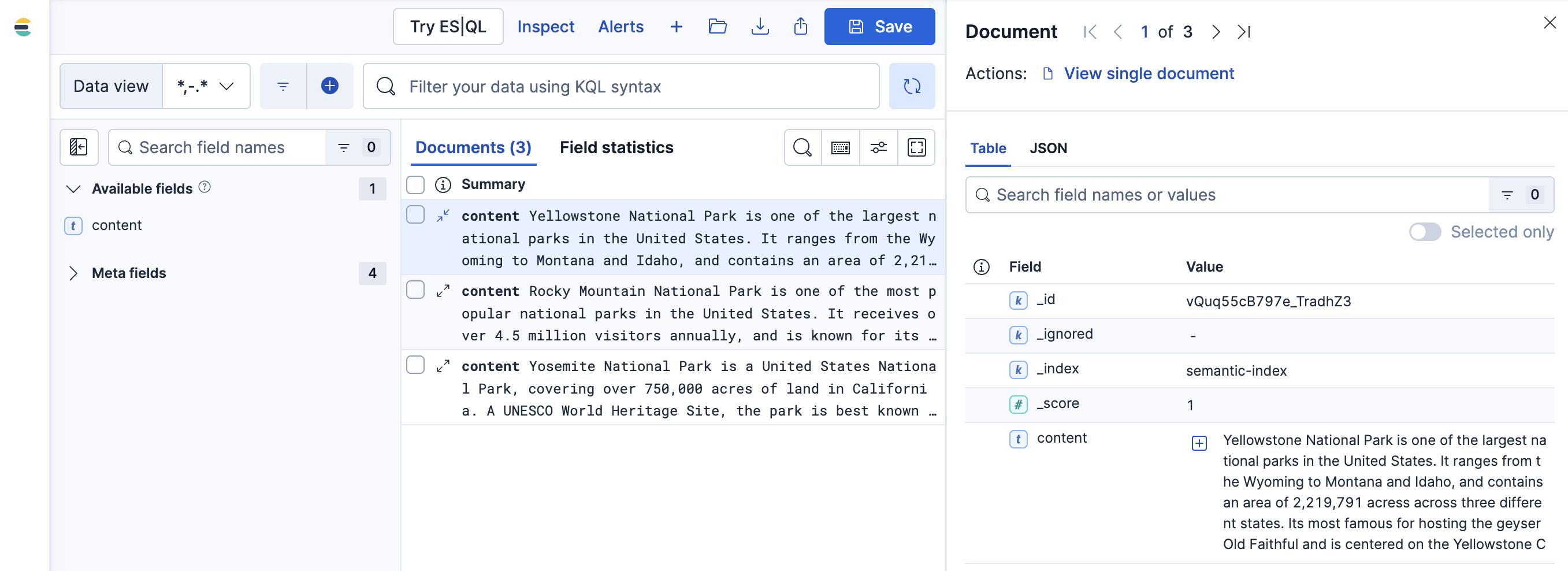 2. A simplified syntax for the MATCH search function, this command performs a semantic query on the specified field. Think of some queries that are relevant to the documents you explored, such as finding the biggest park or the best for rappelling.