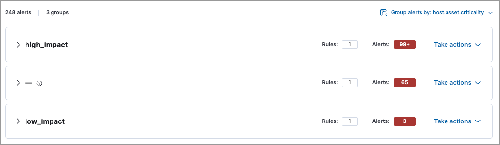To group alerts by entity risk level or asset criticality level, select Group alerts by, then select Custom field and search for: