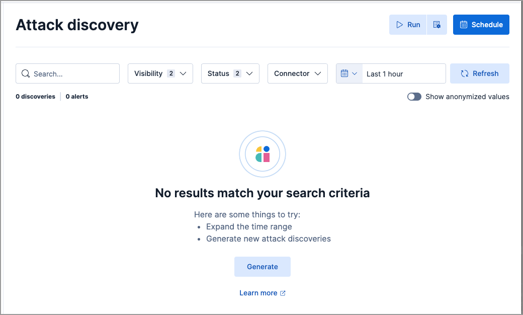 Attack discoveries are automatically saved on the Attack Discovery page each time you generate them. Once saved, discoveries remain available for later review, reporting, and tracking over time. This allows you to revisit discoveries to monitor trends, maintain audit trails, and support investigations as your environment evolves.