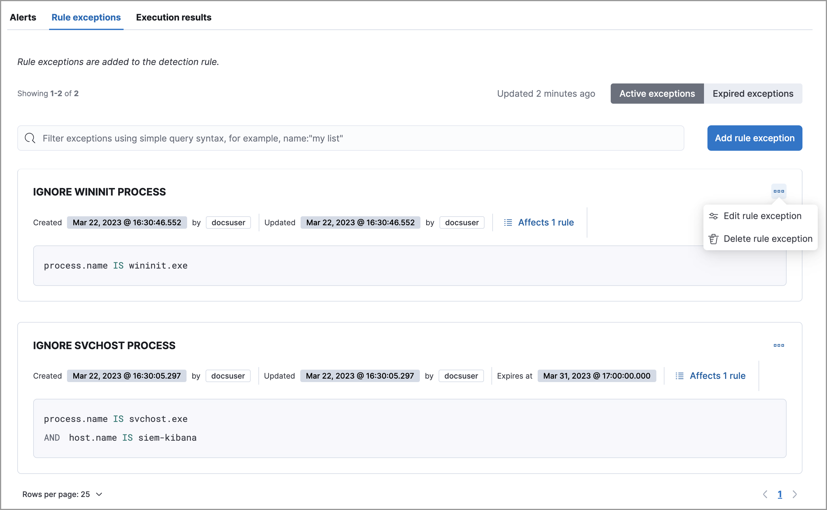 You can add exceptions to a rule from the rule details page, the Alerts table, the alert details flyout, or the Shared Exception Lists page. When you add an exception, you can also close all alerts that meet the exception’s criteria.