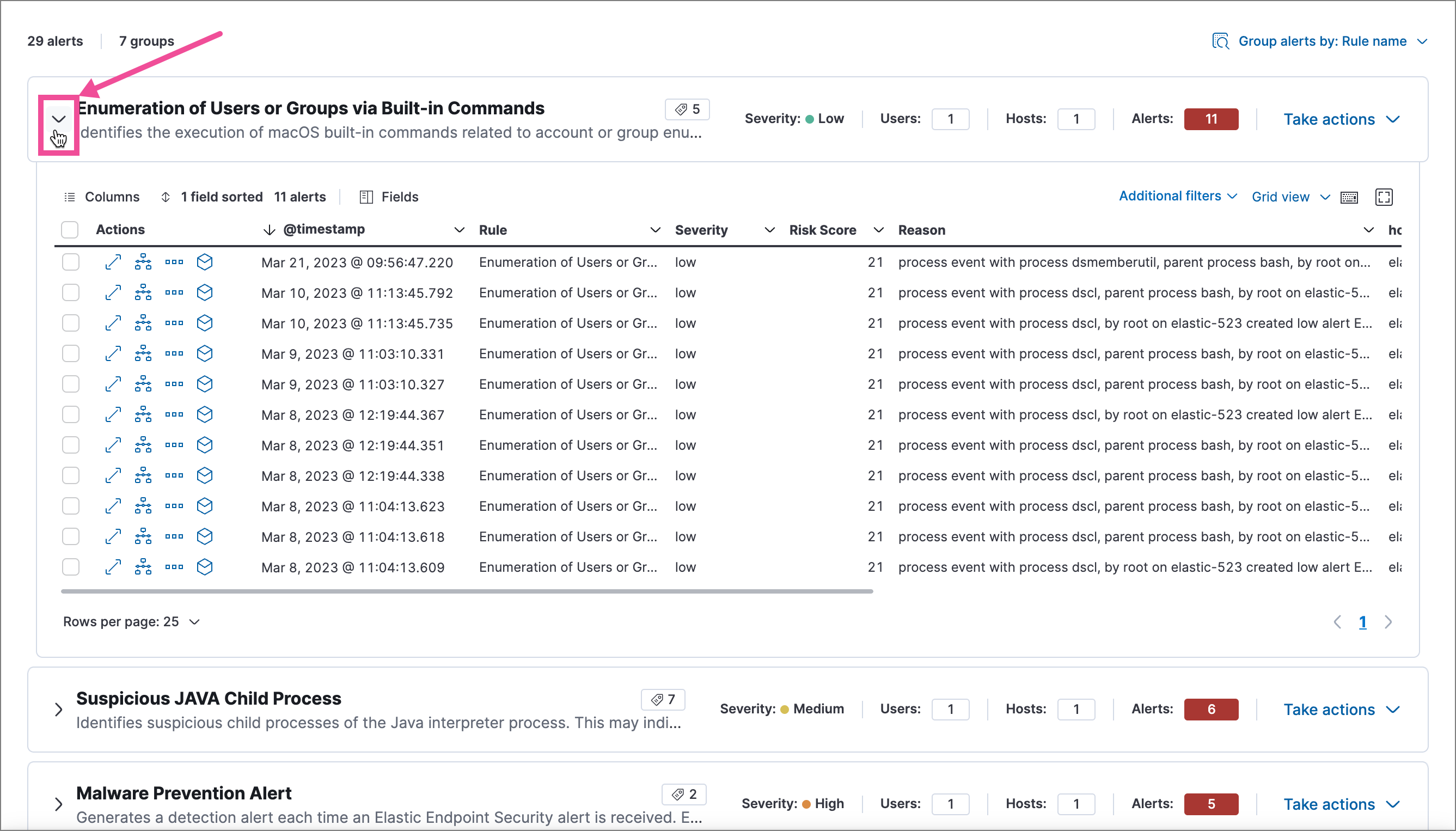 Each group displays information such as the alerts' severity and how many users, hosts, and alerts are in the group. The information displayed varies depending on the selected fields.