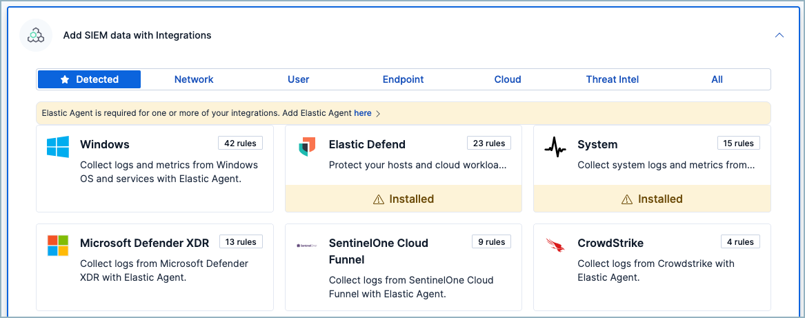 Use the Add SIEM data with Integrations section to set up data ingestion from third-party sources. If at least one rule migration has completed, the Recommended tab shows integrations that provide the data needed by your translated rules. These include both Elastic-managed integrations and any applicable custom creations you made using automatic import.